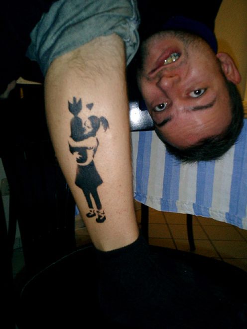 Works by Banksy Graffiti Art is something that is famous and crazy world today. Art is expected to be made by a man named Robert Banks. Banksy creates a very thin difference between vandalism and graffiti art itself. Now Banksy graffiti has evolved even further, far more creative. Not just about the only graffiti but have started to be used in tattoo art images previously created. Put on a skin and is described in the patent. But of the many outstanding Banksy picture there are some very popular and famous in the eyes of many people like a girl wearing a gas mask, and two male police officers Embracing and kissing EACH other. Banksy's images have been replicated as tattoos as well, the most Notable being his famous "Girl with Balloon" seen here, featuring a young girl losing her grip on a solitary red balloon.