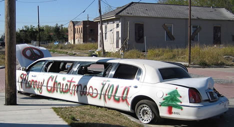 This limousine was tagged after Hurricane Katrina in New Orleans. The Christmas graffiti occurred after Wal-Mart was looted. Even in the midst of disaster and bad times, street artists who some consider vandals still tried to offer peace and season’s greetings.