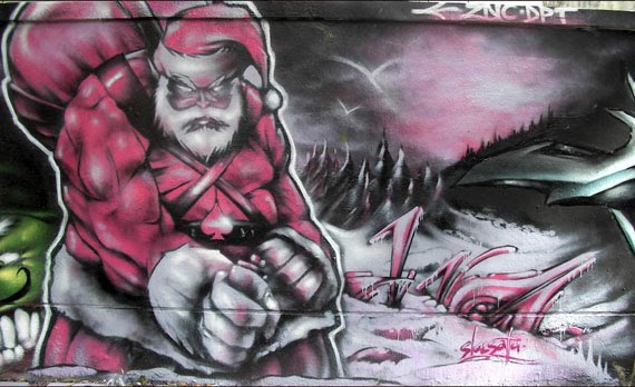 This wall was photographed and posted as Evil Santa. This particular wall can be found in Greece. With a project this large, the undertaking is much less of a tag and more of a celebrated work of art. Graffiti in all forms can be found spray painted in all corners of the planet. It is one more common bond that makes us all united, as is celebrating this holiday season.