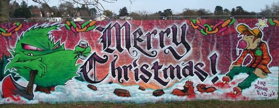 Some graffiti is simple. The point is to tag and run. These spray paint tags started in NYC and Philadelphia but now are found all over the world. Tags are not always about gang markings. It is a debate among many if graffiti is a form of street art or vandalism. From sweet or funny tags to more sinister Christmas works, urban walls and trains are common places for graffiti writers to leave their holiday message.